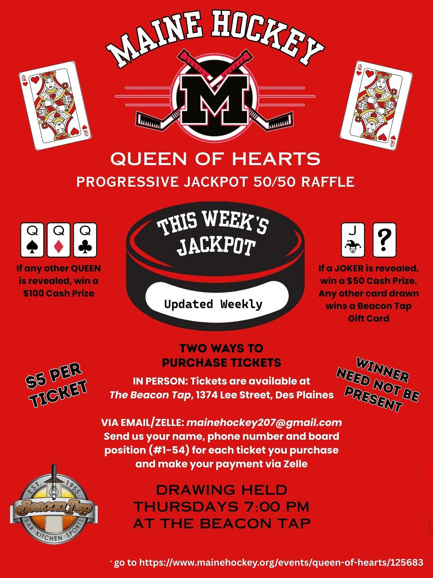 • Raffle Drawings: Will be conducted every THURSDAY at 7pm by a representative of Maine Hockey Club at the Beacon Tap. ONE Ticket will be selected in a random drawing from all Tickets sold that week. The board number on the Ticket will determine which of the 54 cards on the board is opened.